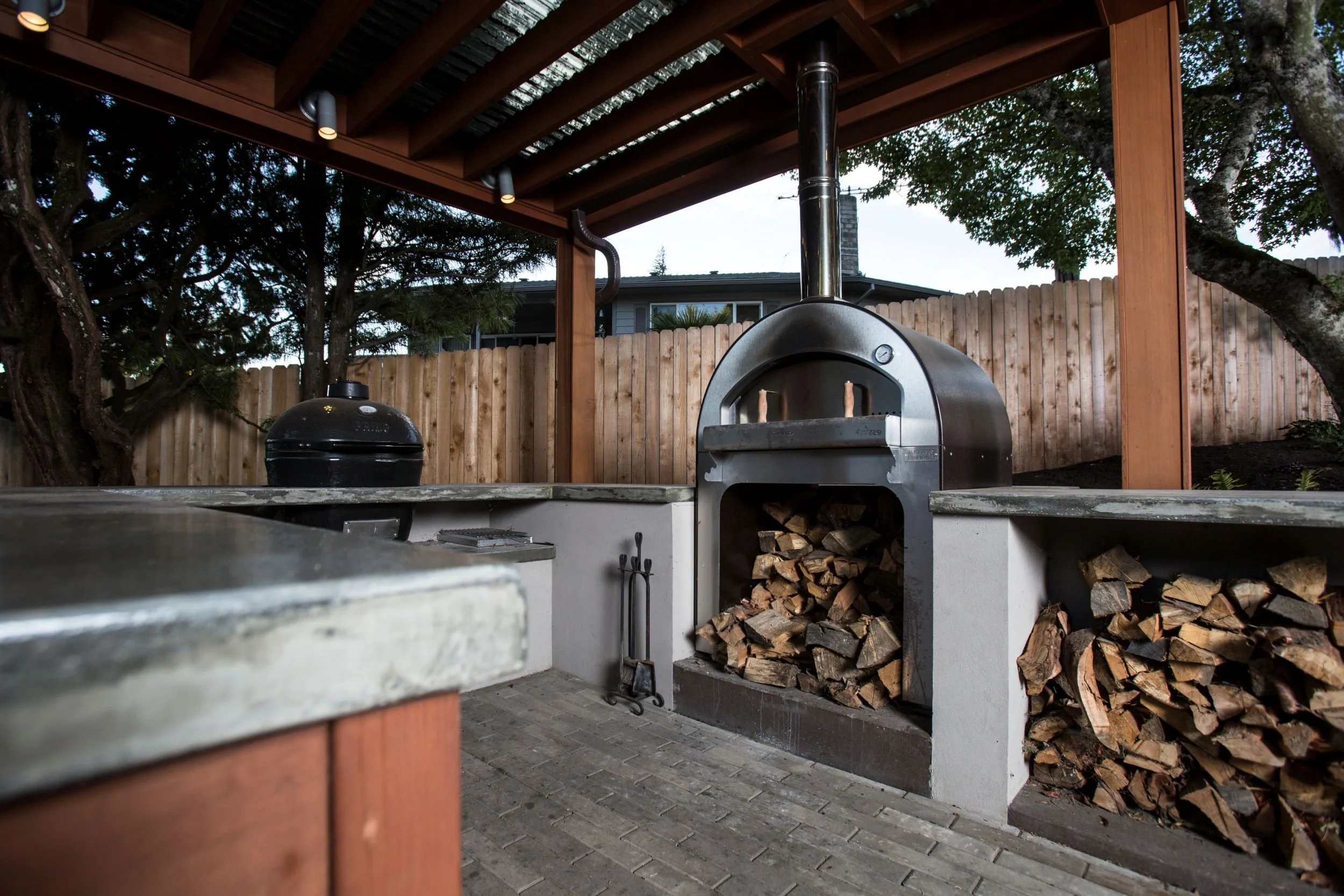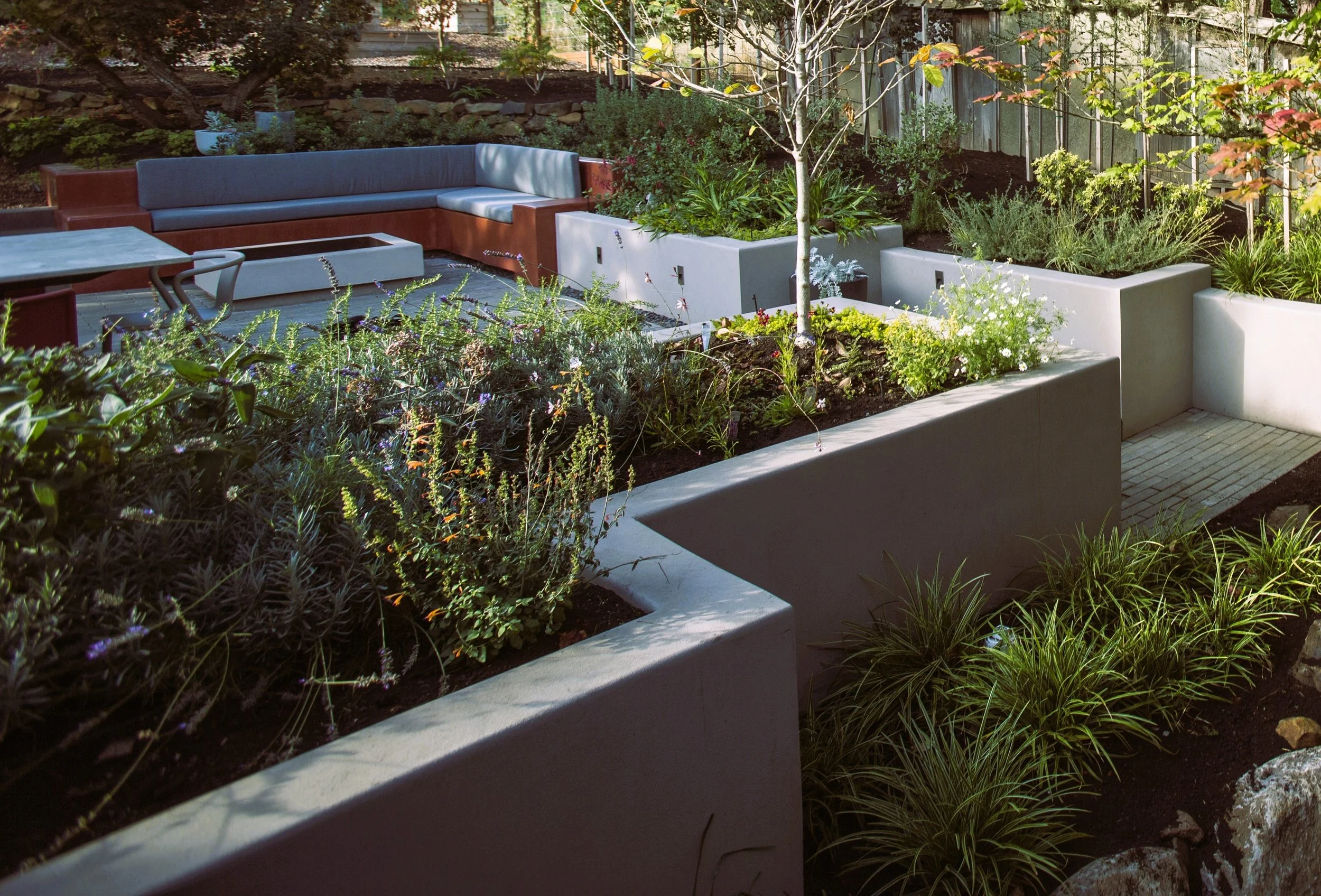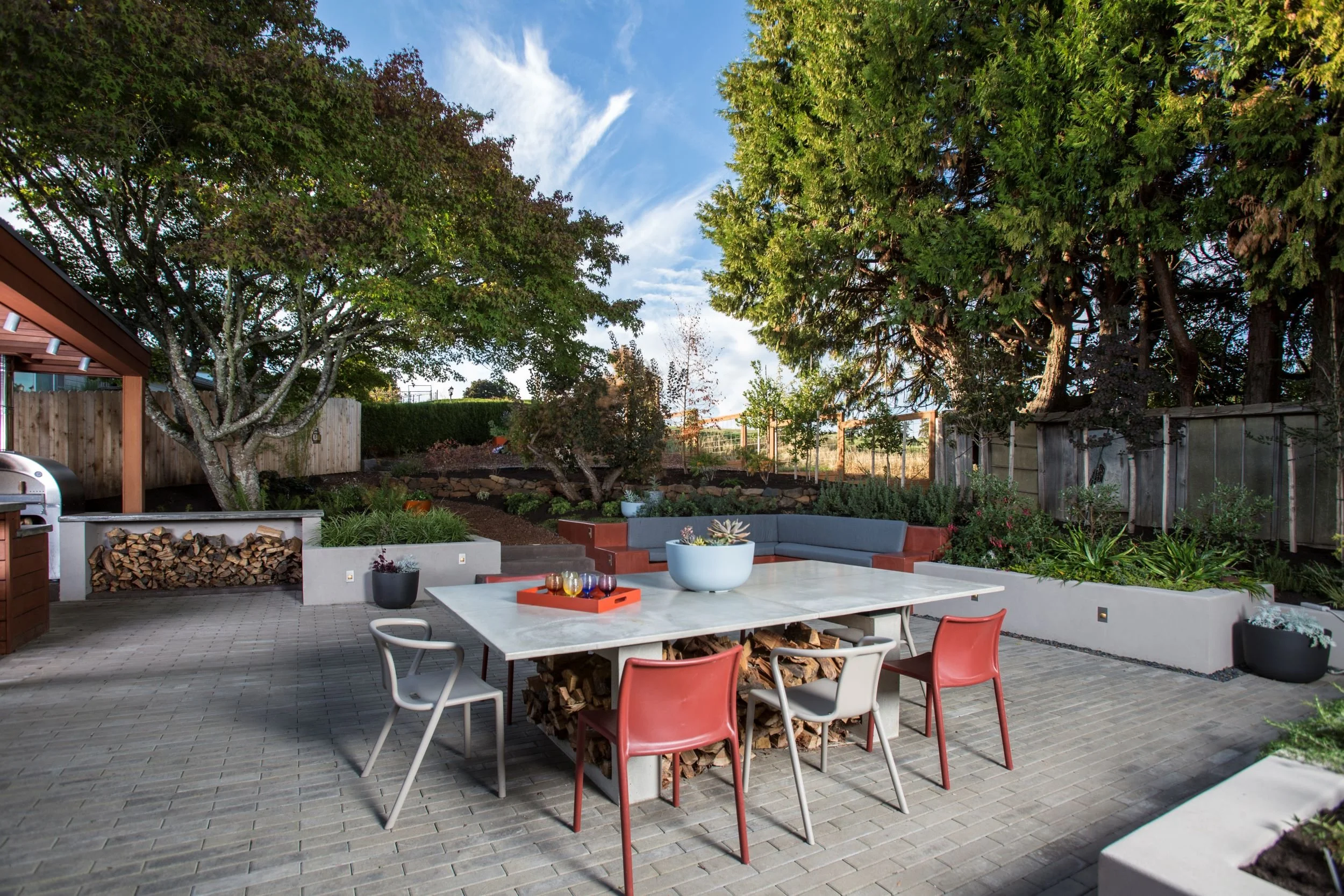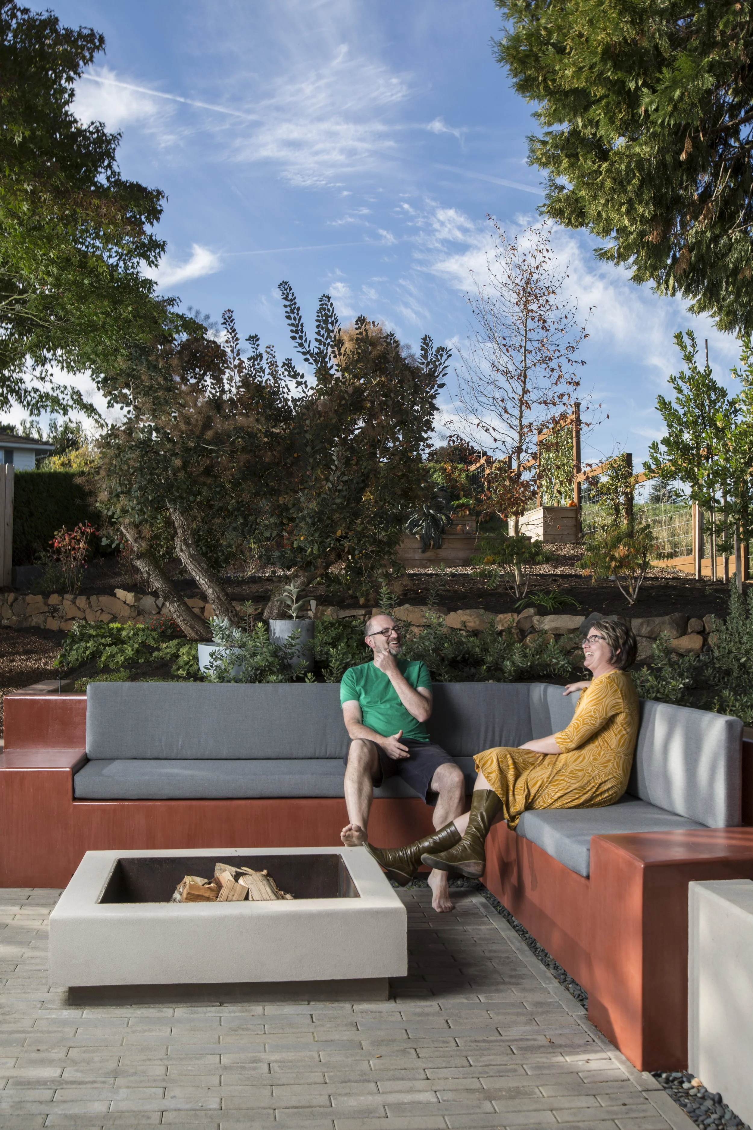A series of stepped outdoor rooms maximize the clients' use of the exterior space on their steeply sloping lot. The outdoor living areas are large and accommodating with plenty of room for entertaining, play and gardening. The garden features an outdoor kitchen with pizza oven and a dining table that converts to table tennis. From the built-in bench surrounding the fire pit, there is a stunning view of Mount Hood. Raised planters for vegetables and herbs set into the hillside complete the garden. Landscape installation by DeSantis Landscapes. Photography by Jonathan House.
